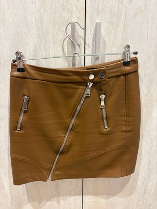 Falda de cuero marrón de la marca Pepe Jeans. Está en muy buen estado. - Talla: L - Cierre de botones delanteros - Dos bolsillos funcionales - Detalle trenzado en la cintura
