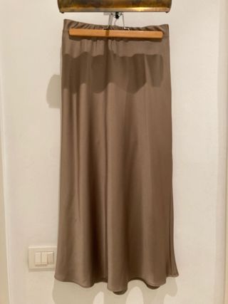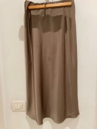 Falda larga de raso con un bonito color marrón. Es una prenda elegante y versátil. - Tejido satinado. - Cintura elástica.