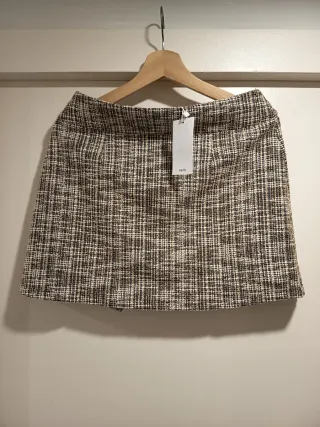 Falda de Mango nueva con etiqueta con un bonito estampado jaspeado en tonos beige y marrón. Es una prenda versátil y elegante. - Tejido de tweed con textura. - Diseño con vuelo. - Cintura estructurada.