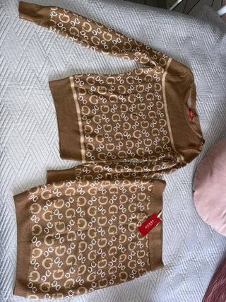 Conjunto de dos piezas de la marca Guess, compuesto por un jersey de manga larga y una falda muy comodo y original a estrenar Envios rapidos mas en mi perfil - Diseño con estampado integral del logo GG. - Tonos beige y marrón.