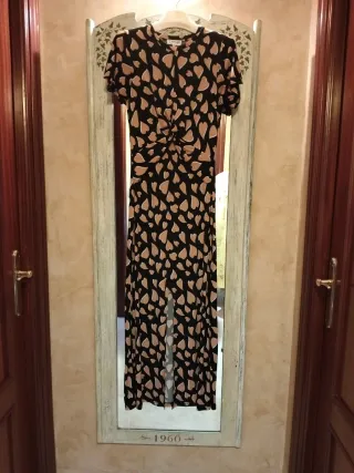 Vestido midi con un estampado de corazones en tonos marrón clarito sobre fondo negro. Presenta un diseño cruzado en la cintura y una abertura en la falda. - Diseño cruzado en la cintura. - Abertura en la falda. - Estampado de corazones.