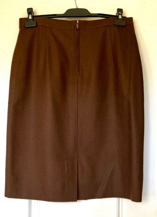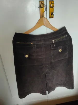 Falda de corte recto en color marrón. Presenta un diseño con costuras en forma de V y dos botones decorativos en la parte frontal. - Detalle de pliegues en la parte inferior. - Cierre de cremallera. Se vende falda de paño de color marrón. talla 48 5€