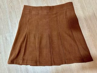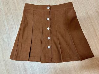 Falda corta de color marrón con detalle de botones y tablas. - Diseño plisado. - Cierre de botones frontales. No hago cambios.