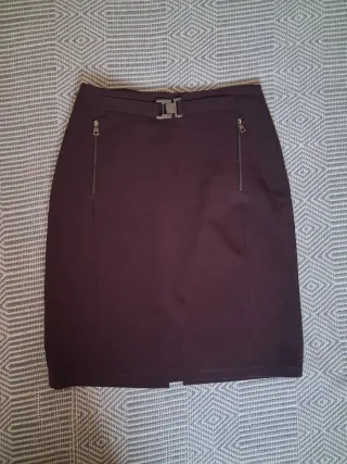 Falda de corte recto en color marrón. Presenta un diseño moderno con detalles de cremalleras. - Cremalleras decorativas en los laterales. - Hebilla metálica en la cintura.