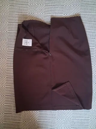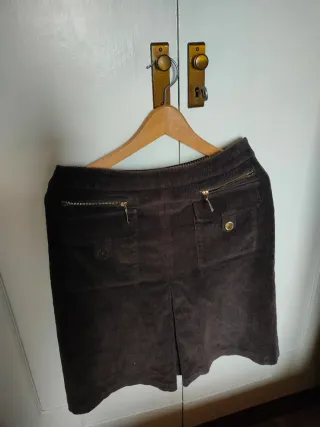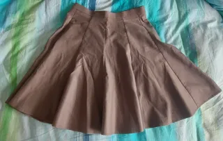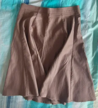Falda de la marca Trucco en color marrón. Es una prenda con un diseño elegante y versátil. Tiene un pequeño descosido sobre el cierre trasero, fácil de coser. - Talla L (equivalente a 40). - Corte acampanado. - Tejido de calidad.