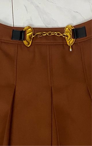 Elegante falda midi de color marrón. Presenta un diseño con pliegues y un detalle de cadena dorada en la cintura. - Detalle de cadena dorada, cuero y perlas. - Diseño con pliegues. - Composición 60% Lana 40% Polyester