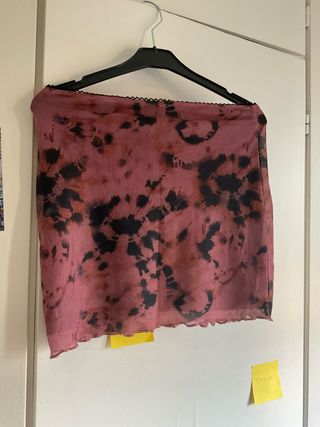 Mini falda con estampado tie-dye en tonos rosas y marrones. El tejido es ligero y elástico y tiene un acabado festoneado en el bajo. No tiene marca indicada. - Estampado tie-dye. - Bajo festoneado. Tiene dos pequeños descosidos mostrados en las fotos, imperceptibles al llevarla puesta.