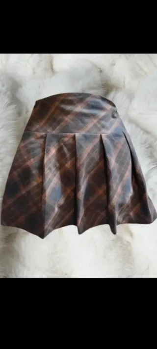 Falda de piel en tono marrón. Diseño elegante y versátil. - Material: 100% Piel porcino. - Color: Marrón. Recoger en Puente de Vallecas.