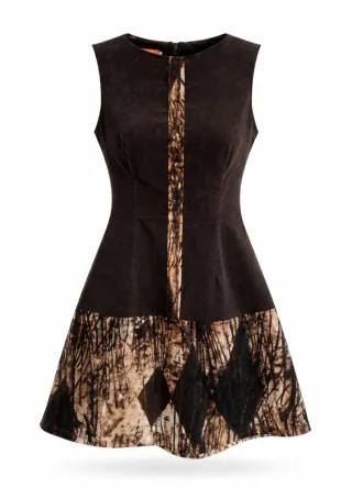 Vestido de pana marrón con un diseño estampado único en la falda. Es sin mangas y tiene un corte que favorece la figura. - Diseño con franja central. - Estampado abstracto en la parte inferior. - Cierre de cremallera.