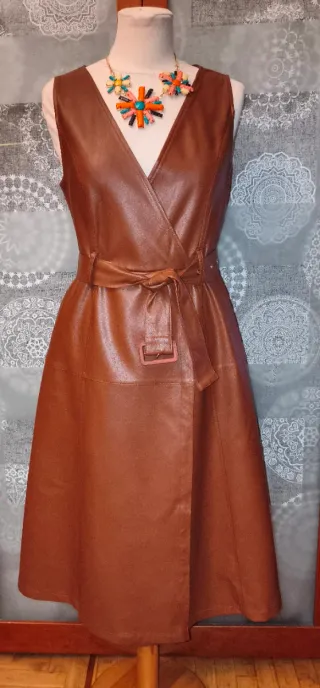 Vestido midi de piel sintética con un diseño cruzado y cinturón. - Diseño cruzado con escote en V. - Cinturón a juego para ajustar la cintura. - Largo midi. - Sin mangas. Maravilloso y original vestido midi de piel sintetica en un precioso marrón medio, cuerpo y falda cruzados, falda evase, con cinturón del mismo material, cremallera en el costado y bolsillos talla S de boutique Italiana Mediados: Hombro 33 cm Sisa 43 cm Cintura 40 cm Cadera 50 cm Largo 108 cm 29,99 €