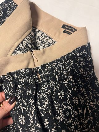 Minifalda de Massimo Dutti con un bonito estampado floral. - Diseño con encaje. - Color negro y blanco con cintura en marrón camel.