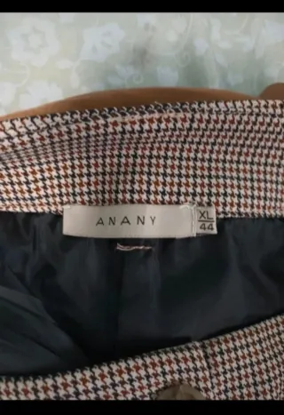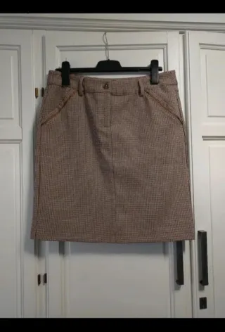 Falda estampada marrón. (Talla 44). - De corte recto con un estampado de cuadros. - Detalle de bolsillos delanteros con ribete y cintura con trabillas. - Va forrada por dentro. Apenas puesta. Sin desperfectos. Medidas: Cintura 41 cm (por delante). Cadera 49 cm (por delante). Largo 53 cm.
