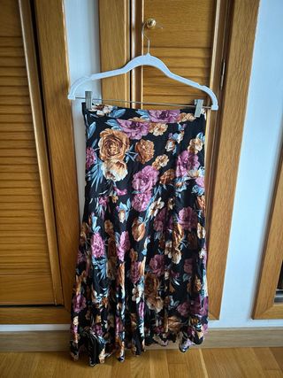 Falda midi con estampado floral de Stradivarius. Ideal para un look casual o arreglado. - Diseño con flores en tonos rosas, marrones y azules. - Largo midi.