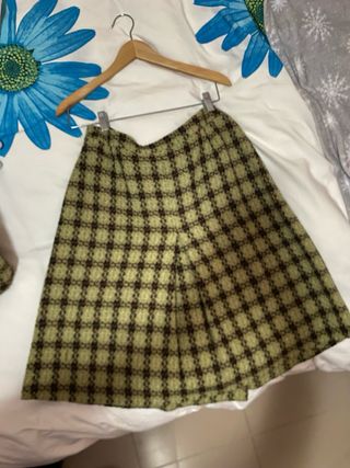 Conjunto de abrigo y falda de la marca Sfera. El abrigo es de cuadros marrones y verdes, con cinturón. - Abrigo con cuello solapa. - Cierre de botones. - Falda a juego.