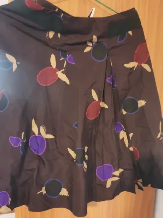 Falda con un estampado divertido de frutas en tonos marrones y morados.y dorado - Diseño con vuelo. - Cintura marcada. - Tejido satinado.