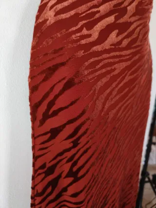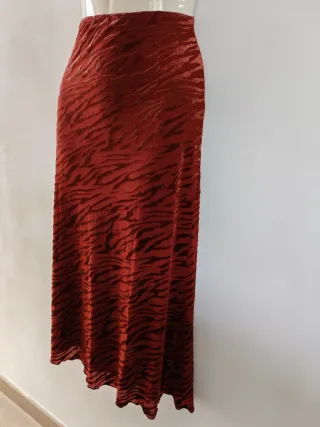 Falda larga con un llamativo estampado de tigre en tonos marrones y rojizos. Su diseño fluido la hace muy cómoda y versátil. - Tejido con textura aterciopelada. - Largo hasta los tobillos. - Cintura elástica. Super bonita. Con relieve de rayas de tigre en terciopelo. Al andar brillan de distinta manera y queda sensacional. Ligeramente elástica, vale para varias tallas. S, M, L...