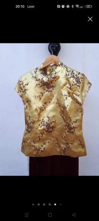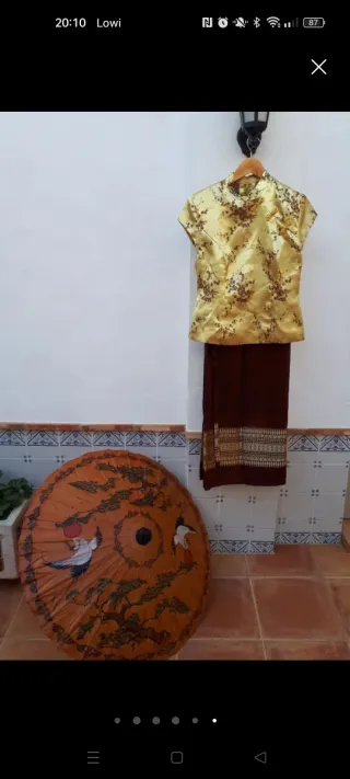 Conjunto de inspiración oriental para mujer. Se puede usar como disfraz. Comprado en Tailandia. En perfecto estado. Talla M-L - Prenda superior dorada con estampado floral. Seda. Hecha a mano. - Falda larga marrón con detalle de pasamanería dorada. Incluye sombrilla
