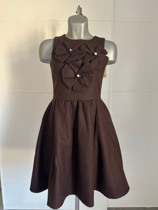 Espectacular vestido de la firma española Strena. Es una pieza muy especial, confeccionada en un tejido con cuerpo (estilo lana/paño) en un color marrón chocolate muy elegante y tendencia. Corte: Sin mangas, con cuello redondo y falda con tablas que aporta un volumen muy femenino y estructurado. Ocasión: Ideal para eventos de invierno/primavera, bautizos, comuniones o comidas especiales. Medidas (en plano): Axila a axila: 42cm Cintura: 37cm #strena #vestidomarrón #flores #invitada #modaespañola #vestidoboda #chic #boutique