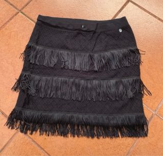 Falda corta negra con diseño de flecos. - Tres niveles de flecos. - Tejido con textura. - Está con la etiqueta sin estrenar.