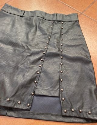 Falda corta de cuero sintético con un diseño moderno y atrevido. - Detalle de tachuelas metálicas a lo largo de la parte delantera. - Abertura frontal. - Cintura con trabillas.
