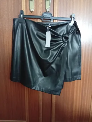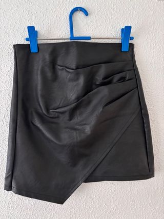 Falda corta de Mango con un diseño moderno y elegante. - Confeccionada en un material con efecto piel. - Detalle de anilla metálica en la cintura. - Diseño cruzado. - Corte asimétrico.