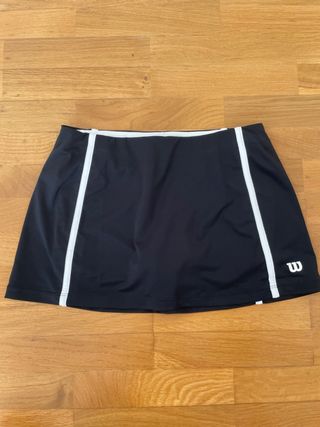 Falda pantalón de pádel o tenis de la marca Wilson. Negra con detalles laterales en color blanco. Cintura elástica. Logo de Wilson en la parte inferior derecho. Nueva sin etiquetas.