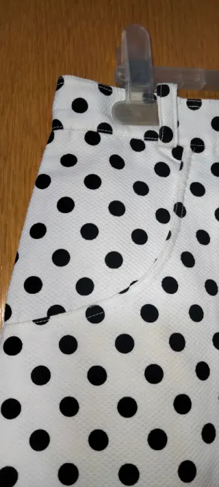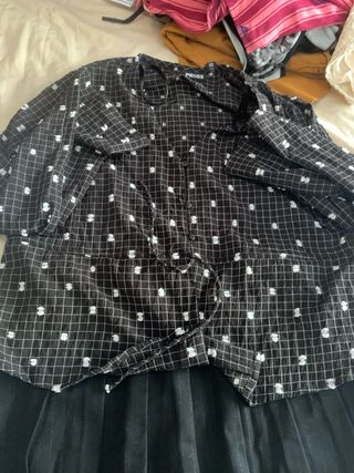 conjunto blusa de vestir blanca y negra y flada negra sin estrenar. - Estampado de cuadros blancos sobre fondo negro. - Detalle de pequeños motivos blancos. - Diseño con lazada frontal.