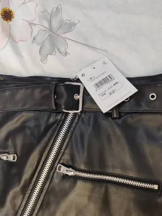 Falda de efecto piel en color negro, con un diseño moderno y detalles que la hacen única. - Diseño con cremallera frontal asimétrica. - Incluye cinturón a juego. - Bolsillos con cremallera decorativos. - Bolsillo lateral con botón a presión.