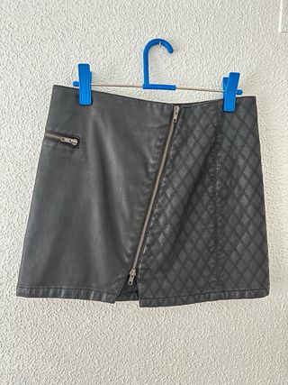 Falda corta de cuero sintético con un diseño moderno y atrevido. - Cierre frontal con cremallera. - Dos bolsillos delanteros con solapa. - Detalle de anilla en la cremallera principal. - Material: Cuero sintético.