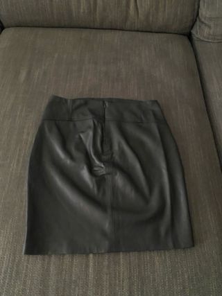 Falda negra con efecto cuero en parte frontal. En perfecto estado. Cierre con cremallera parte de atrás. Efecto tubo. Con forro. Talla 36. Contorno cintura 75 cm. Largo 48 cm.
