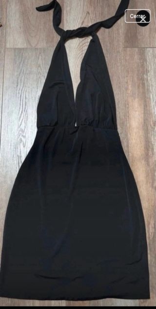 Vestido fluido negro de manga larga. Corte asimétrico en la falda, con picos, espalda descubierta ajustable con cordones lazo. Tejido elástico, algo brillante / hace aguas. La tela es muy gustosa y se ajusta al cuerpo.