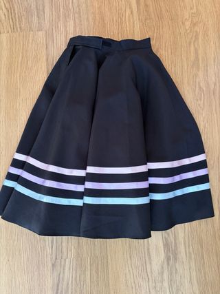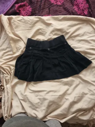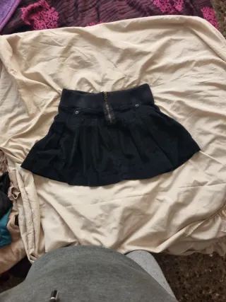 Falda corta de color negro. Con costura ancha d adorno x delante y x detrás,con 2 botones metálicos para ajustar según la medida d la cintura ,lo cual también puede ser la XS - Diseño liso.con forro - Cintura alta.
