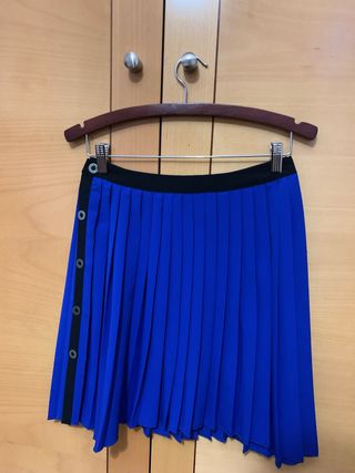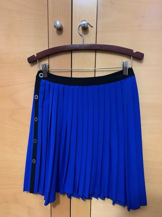 Falda de tablas en color azul, con un diseño moderno y detalles de botones en un lateral. - Diseño plisado. - Detalle de botones negros. - Cintura con banda negra.