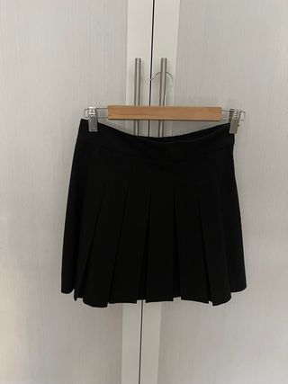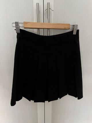 Falda corta negra con tablas en la parte inferior y cinturón con hebilla.