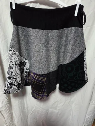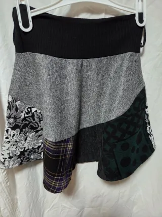Falda corta de diseño exclusivo tipo patchwork con mezcla de texturas y estampados (cuadros, floral, tweed y geométrico). Ideal para un look boho o alternativo con botas y medias. Características: Cintura: Banda ancha elástica tipo "rib", muy cómoda y favorecedora. Colores: Tonos gris, negro, verde botella y detalles en morado. Estado: Excelente estado, como nueva. Medidas (tomadas en plano): Cintura: 39 cm (al ser elástica, cede un poco más). Largo total: 52 cm (queda por encima de la rodilla según altura). Hago envíos rápidos por Walapop o entrega en mano .#falda #patchwork #boho #invierno #faldacorta #tweed #alternativo