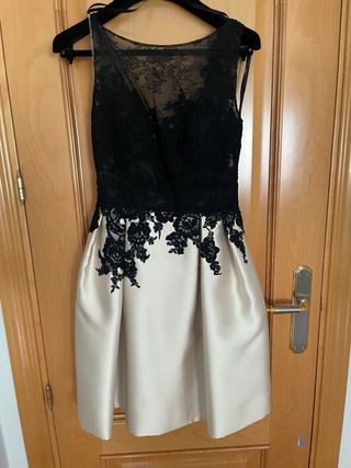 Elegante vestido corto de Pronovias, ideal para invitadas. Combina un sofisticado diseño en encaje negro sobre una base de satén en tono beige. - Cuerpo de encaje con escote ilusión. - Falda corta con vuelo y detalle de encaje en el bajo. - Cierre de cremallera en la espalda. Tiene un pequeña mancha en la falda