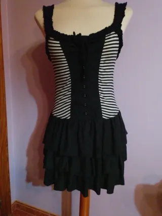 Vestido corto con un diseño llamativo y desenfadado. - Cuerpo con corsé, botones y cordón - Mangas tipo ganchillo. - Falda con volantes. Lotes, descuentos y más en mi perfil. Pregunta sin compromiso.