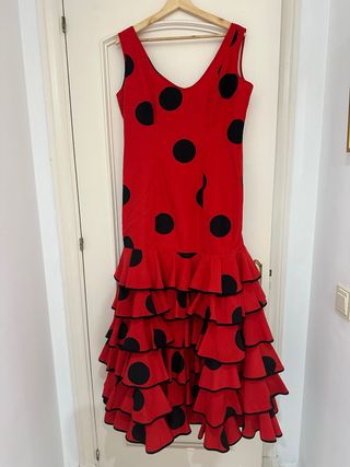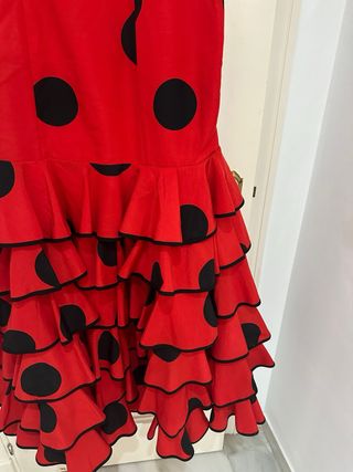 Precioso vestido de flamenca, rojo con lunares negros. Ideal para la feria. - Talla 42-44 - Diseño elegante y favorecedor. - Falda con volantes. - Confeccionado con tejido de calidad. - Bolsillo interno. Entrega en mano en Jerez de la Frontera o envío