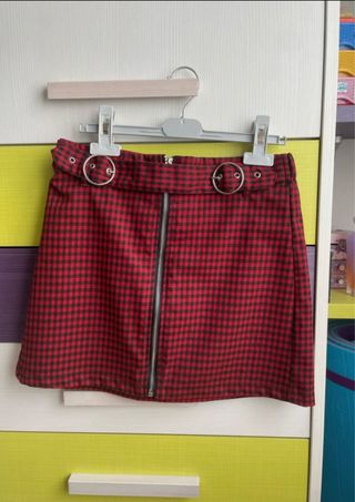 Falda corta con estampado de cuadros. - Diseño con cremallera frontal. - Detalle de anillas metálicas en la cintura.
