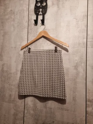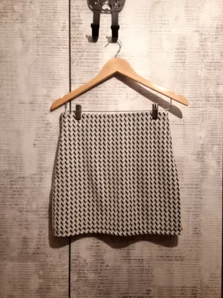Falda corta con un diseño geométrico en blanco y negro. Es una prenda versátil y moderna. Goma interior en cintura. - Diseño de espiga. - Tejido texturizado.