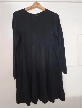 Vestido negro de manga larga con un diseño de corte imperio y falda con volantes. - Cuello en pico. - Tejido con textura. - Manga larga.