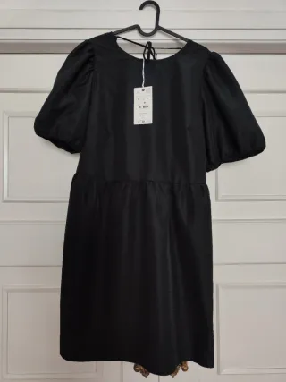 Vestido negro con mangas abullonadas y falda con vuelo. - Diseño con corte en la cintura. - Cierre con lazada en la espalda. - Tejido ligero.