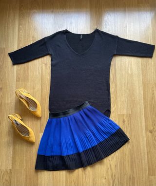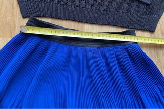 Falda corta con un diseño plisado y dos tonos. - Cintura elástica. - Diseño de dos capas: azul eléctrico y negro.
