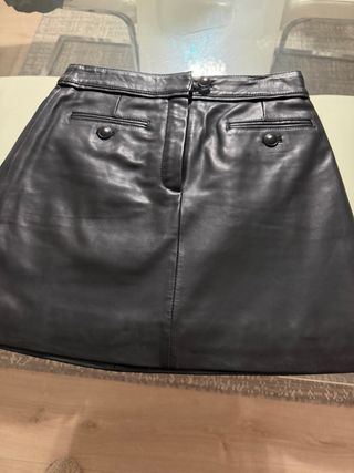 Preciosa falda de cuero de la marca Scalpers. Es de color negro y tiene un corte elegante. Comprada hace poco, pvp 200 euros - Talla: (Añadir talla) - Cierre: Cremallera y botones - Bolsillos: Dos bolsillos funcionales delanteros - Estado: Nueva
