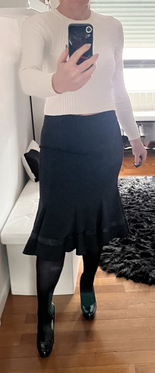 Elegante falda negra de la marca Rinascimento. Tiene la cinta de abajo un poco desgastada - Diseño con volantes y detalles en cinta. - Corte favorecedor.
