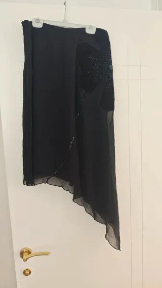 Elegante falda negra con un diseño asimétrico y detalles de pedrería. - Corte asimétrico. - Adornos de pedrería en el lateral. - Tejido ligero y fluido. Ideal para fiestas como noche vieja