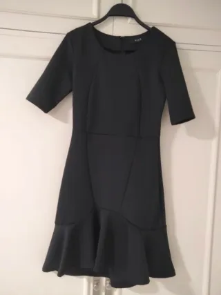 Elegante vestido negro con un diseño moderno. - Mangas cortas. - Falda con volante asimétrico.