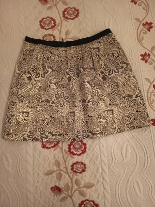 Falda corta con un diseño llamativo de lentejuelas negras y doradas. - Diseño de lentejuelas en ondas. Films negras y films marrones. - Forro. - Cremallera en el lado izquierdo. - Exterior: 100% Poliester. - Forro: 100% Poliester. - Largura: 36cm.