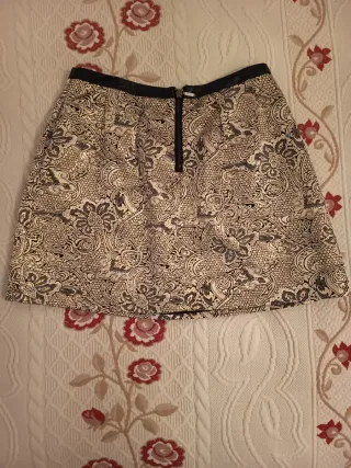 Falda corta, negra con figuras geométricas en blanco, talla M, marca Mango