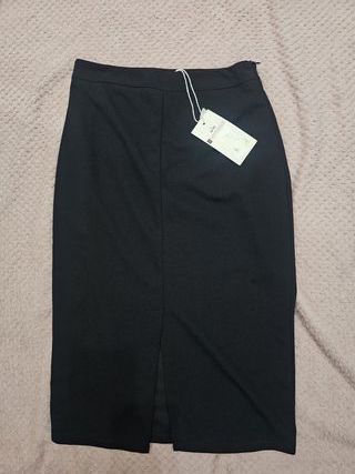 Elegante falda lápiz de color negro. Presenta un diseño clásico y versátil, ideal para diversas ocasiones. - Diseño de corte recto. - Abertura frontal para mayor comodidad y estilo. - Cremallera lateral para cierre.